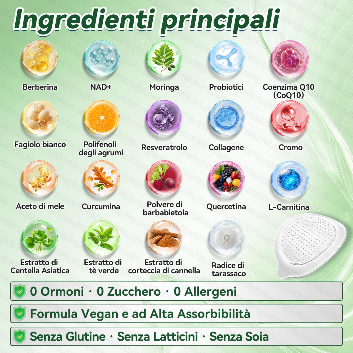 Benefici:Supporta una riduzione efficace del peso e la regolazione dell’appetito, stabilizza la glicemia, favorisce la salute cardiovascolare, riduce l’infiammazione cronica di basso grado e contribuisce ad alleviare la stanchezza legata al metabolismo.